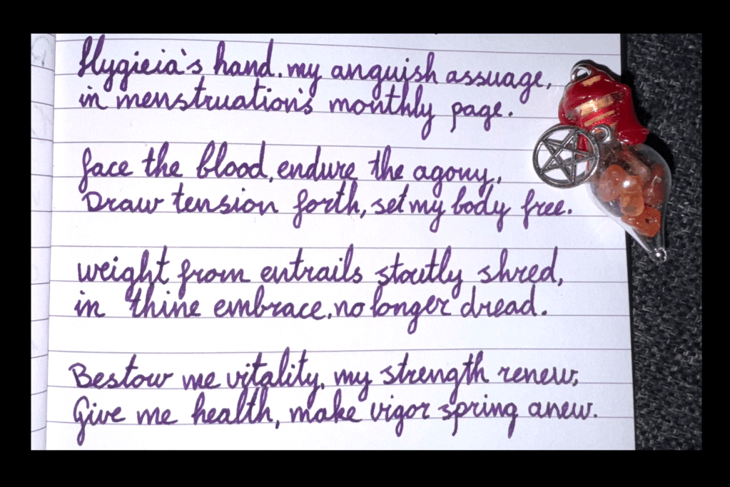 I decided to focus on Hygieia for once to see if I can connect with her and focus on a spell jar to improve health and strength during menstruation. Holding the little jar is now a reminder of the strength in my body and triggers me to relax parts I wasn’t aware were tense.